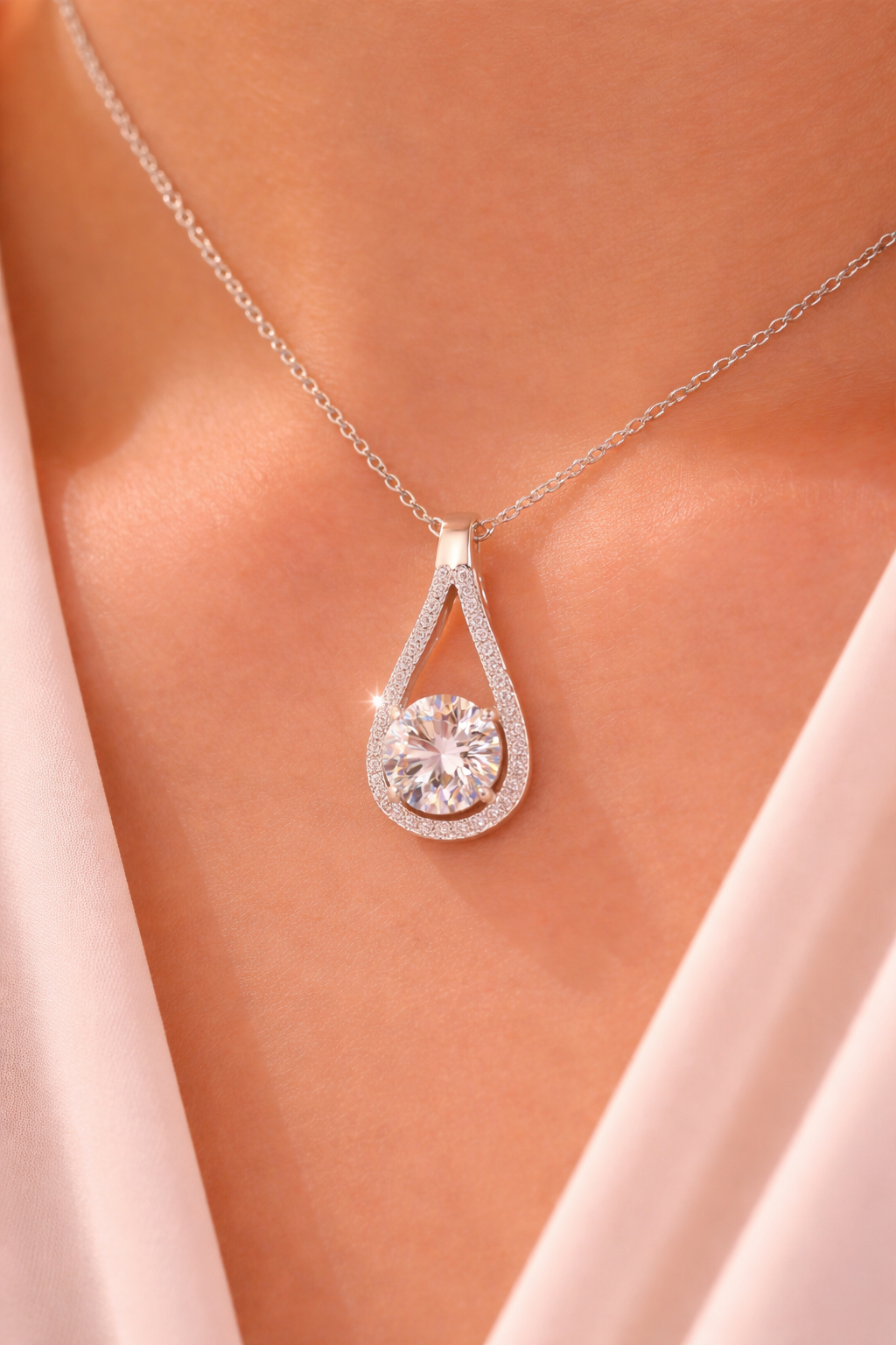 Designed to catch the light beautifully, this teardrop pendant showcases a brilliant center stone framed by subtle sparkle. A refined piece that adds instant sophistication to any look.